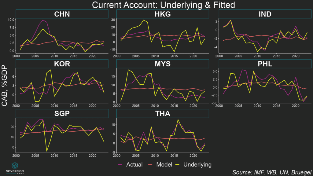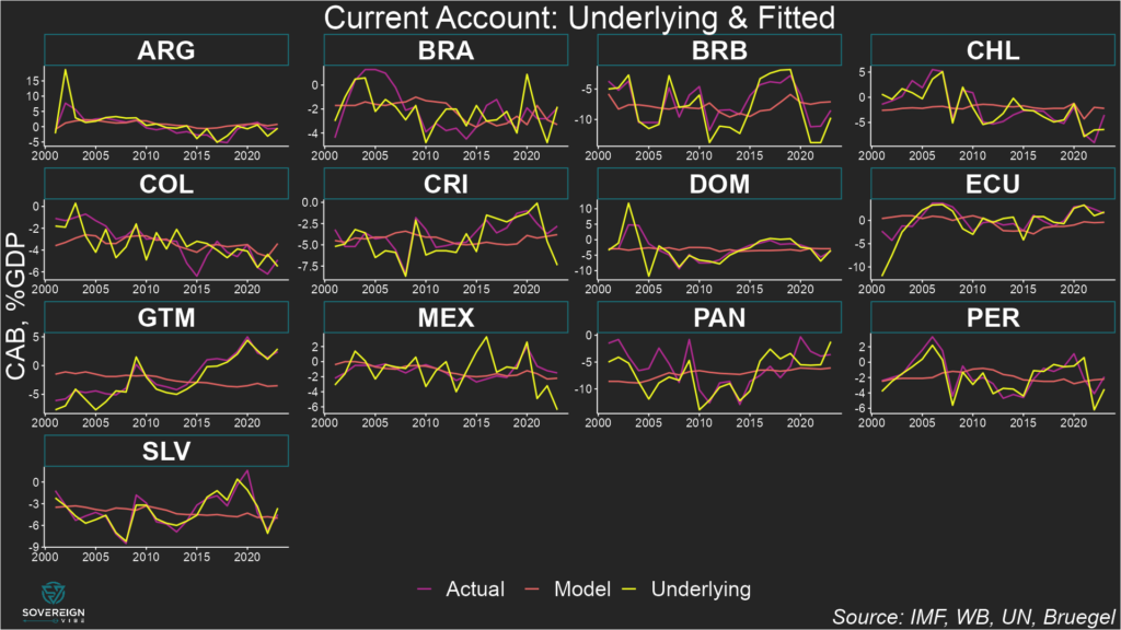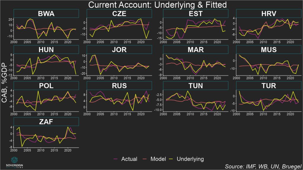 In other words, seeing where and underlying CAB stands in relation to equilibrium reveals where a currency is over- or under-valued, but not the magnitude of the divergence from fair value.