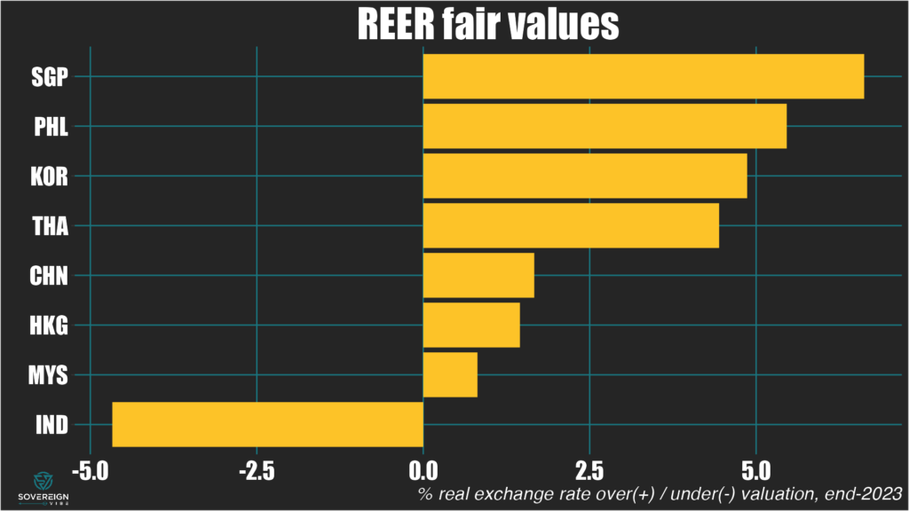 Of the eight EM Asia countries covered below, only the Philippine peso and Korean won strengthened in real terms in 2023, though the Singaporean and (possibly) Hong Kong dollars were also in positive territory for the year.