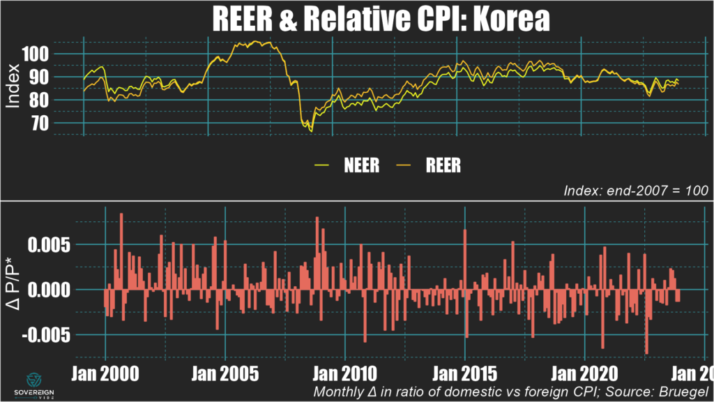 🇰🇷 South Korea: The won’s real exchange rate strengthened slightly in 2023, mirroring the nominal dynamic, with any inflation differential with trading partners close to zero.