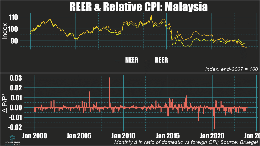 🇲🇾 Malaysia: The ringgit depreciated by nearly 5% in real terms over the course of 2023, with both nominal weakening and negative inflation differentials contributing.