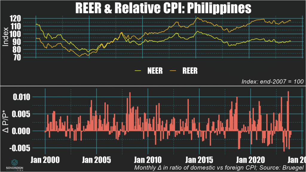 🇵🇭 Philippines: The peso is one of the few currencies in this selection of EM Asian countries to have experienced a real appreciation in 2023, alongside the Korean won and Singaporean dollar. This modest real appreciation was driven by nominal strengthening and a positive inflation differential.
