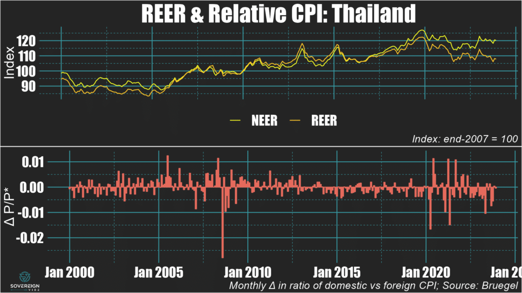 🇹🇭 Thailand: The baht weakened very modestly in real terms in 2023, mostly as a result of a negative inflation differential, while trading flat in nominal terms.